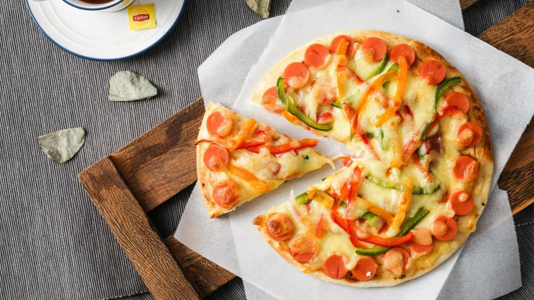第八步:取出披薩,切成小塊就可以食用了,剛做好會(huì)很燙,要注意防護(hù)呀~