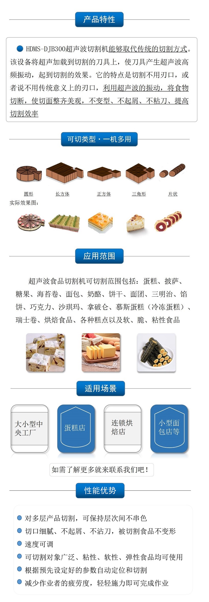 該設(shè)備配備雙把超聲波刀片,既可切方蛋糕,也可同時切兩個圓蛋糕,效率更高 |